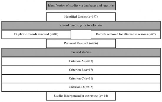 In the first selection phase, the titles and abstracts of the 110 articles were reviewed, applying the inclusion criteria (A), (B), (C), and (D) described in the following section (Table 1). From this phase, 36 articles were selected for the next stage. These articles were independently evaluated by two authors to confirm their inclusion according to the defined criteria. The initial agreement between the reviewers, after the full review, was 98.81%. Discrepancies were resolved through discussion and consensus among the reviewers until achieving 100% agreement. The literature search and selection process are illustrated in Figure 1, presented using a flowchart of study selection.