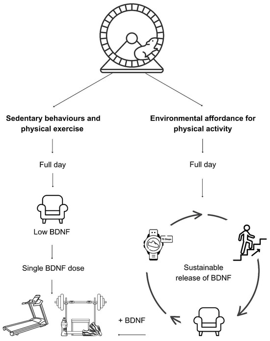 Furthermore, not only can BDNF be associated with improved plasticity at the neurological level, but the role played by the increase in BDNF is promising in multiple mental health and wellbeing issues such as depression [55,56], which is also a proxy measure for AHN, as introduced earlier in this paper, or to hippocampal activity. For instance, a pilot study found that an eight-week exercise intervention improved mood in individuals with major depressive disorder (MDD) but did not enhance memory performance, while both MDD and healthy participants exhibited decreased hippocampal activity, suggesting exercise may increase neural efficiency in low-fit individuals [57]. The authors concluded that exercise promotes neuroplasticity in both healthy and depressed brains, which further affirms the complex interrelationship explored in this paper to urge the design of environments with affordance for physical activity. Additionally, an article explored how environmental factors, particularly exercise and diet, influence neural plasticity through mechanisms involving BDNF signalling, and proposes leveraging these insights to create a “lifestyle pill” for enhancing cognitive function [58]. Thus, environmental affordance for physical activity can be a promising and effective mediator for BDNF, neuroplasticity, and neurosustainability.