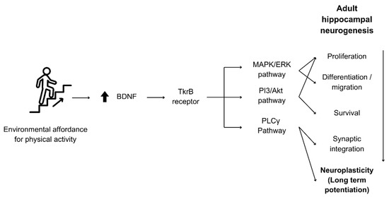 Molecular mechanisms through which BDNF regulates neurogenesis and plasticity by physical activity. Environmental affordance for physical activity increases BDNF levels, which in turn activates the necessary pathways responsible for adult hippocampal neurogenesis and neuroplasticity processes.