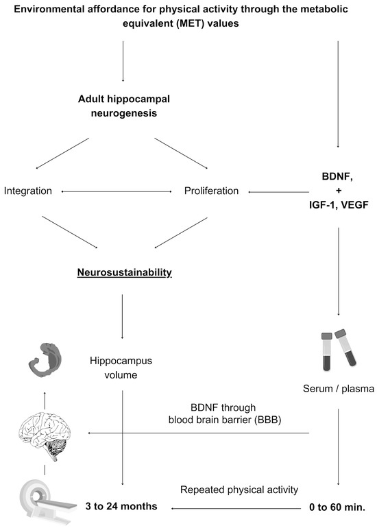 Physical exercise has long been considered a critical modulator of adaptive neuroplasticity changes, neurotrophic factors such as BDNF, and improvements in brain function. A recent systematic review of human and animal studies confirmed that physical exercise increases neuroplasticity through the neurotrophic factors (BDNF, GDNF, and NGF) and receptors that provide improvements in neuroplasticity and cognitive function in humans and animals alike [1]. While physical exercise is known to lead to long-term changes in the human brain, specifically in the hippocampus [2,3,4], it is difficult to explain the volume changes and it is more difficult to tell how the built environment can be a successful promoter for the increase in hippocampus volume if changes are measured after several months. Therefore, it is essential to explore the impact of the physical environment’s capability to increase the immediate release of neurotrophic and growth factors that are known to promote and regulate the neurogenesis, synaptic plasticity, and neurosustainability of the multistage plasticity process in the long term in a sustainably consistent manner. Interestingly, biomarkers are more feasible and testable, and some can be representative by measuring only after one trial of less than one hour [5,6]. This section explores the most reliable and evident factors.