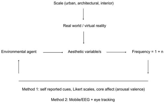 Certain environmental agents can drive the use of the environment, after its affordance for physical activity, not only through structural enrichment but also through visual cues. For example, certain aesthetic variables (such as hominess or fascination) may affect environmental use differently [101,102]. We expand the exploration of environmental agents to include elements in the environment that may drive environmental use and may or may not be associated with the aesthetic variables per se. For example, if natural stimuli influence environmental use rather than artificial ones, they may or may not be associated with an aesthetic variable such as hominess or fascination. In that regard, Figure 4 illustrates the linear relationship expected between environmental agents (natural or artificial) and aesthetic variables, as well as increases in frequency depending on the dynamics between the two former variables. It also explains potential methods either using Likert scales and core effects, as found to be effective in recent studies [102], or through combined Mobile/EEG and eye tracking, which can be more insightful [103,104,105]. Testing this model should be feasible through real-world experimentations or virtual reality [106,107].