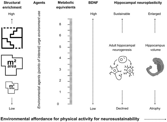 Physical activity is considered the critical element for environmental enrichment in rodent studies in the form of running wheels or the additive effect of structural enrichment to the housing cage that promotes physical activity. However, the translation of physical activity into humans’ lifestyles through a sole reliance on physical exercise reveals that the built environment cannot promote physical activity through its design, which can hinder the sustainability of the hippocampal neurogenesis process and cortical plasticity. In that regard, this article introduces environmental affordance for physical activity as a sustainable model for neurosustainability through the built environment. This model was developed upon the premise that physical activity immediately releases the brain-derived neurotrophic factor (BDNF) and other growth factors, which can be measured in blood and are necessary for regulating hippocampal and cortical plasticity processes. This article explores the relationships between architectural design and BDNF through the mediating role of metabolic equivalents (METs) that can quantify the architectural design’s capability for its environmental affordance for physical activity. Figure 1 briefly illustrates the conceptual model before subsequent sections explore and explain its mechanisms at a quantifiable level.