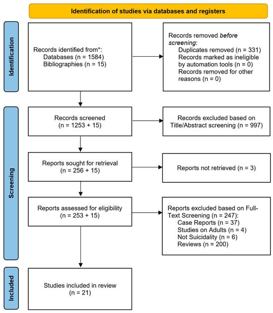 The flowchart in Figure 1 shows the identification and selection process of the papers. Out of the 1584 abstracts retrieved using our search strategy, 331 were removed as duplicates. Thus, 1253 studies were screened, of which 997 records were excluded based solely on title or abstract and 3 reports could not be retrieved. A total of 253 full-text articles were thoroughly assessed for eligibility. Based on a thorough assessment of reviews and the included studies’ bibliographies, fifteen additional records were identified and assessed for eligibility. Hence, 247 articles (47 original studies and 200 reviews) out of 268 were excluded (see Figure 1 for further details). Finally, 21 studies were included in the systematic review. The included studies are summarized in Table 1.