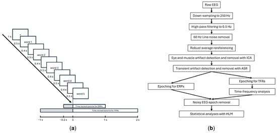 Continuous EEG data were recorded at a sampling rate of 500 Hz on a MacBook Pro computer using a 64-channel Hydrocel Geodesic Sensor Net (EGI, Eugene, OR, USA) connected to a Net Amps 300 amplifier (Electrical Geodesics, Inc., Eugene, OR, USA). Electrode impedances were kept below 50 kΩ, and data were referenced online to Cz. Data preprocessing (Figure 1b) was performed in MATLAB R2024a (The MathWorks, Inc., Natick, MA, USA) using the EEGLAB toolbox []. The raw signal was first down-sampled to 250 Hz for computational efficiency and high-pass filtered at 0.5 Hz. We used the PREP pipeline plugin [] to detect bad channels, apply a robust re-reference, and remove the 60 Hz line noise. Next, we performed an independent component analysis (ICA) using the runica algorithm on a copy of the data that was down-sampled to 100 Hz and high-pass filtered at 2 Hz to improve the efficiency of the ICA decomposition. The resulting ICA weights were then applied to the original data. The ICLabel function was used to automatically label each component. Any component labeled as indicating eye movements or muscle activity with a probability exceeding 90% was excluded. Finally, we used the artifact subspace reconstruction (ASR) algorithm and a 20-burst detection criteria threshold [] to automatically identify and remove portions of the EEG containing large transient artifacts.