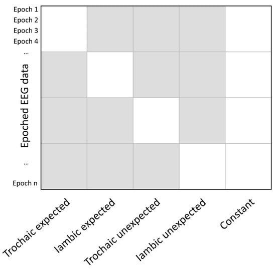 To this end, we manipulated the stress pattern and metrical expectancy of words in a silent reading task. EEGs were recorded while participants silently read five-word sequences. The first four words of each sequence were either all trochaic or all iambic, while the stress pattern of the fifth word in the sequences either matched or did not match the stress pattern of the previous four words. Both the ERPs and time–frequency characteristics of the EEG data were analyzed to identify the neural correlates of implicit stress sensitivity. Building on previous ERP research that manipulated overt [,,,] or implicit [,,] speech rhythm cues, we hypothesized increased negativity in the 200–600 ms window following unexpected trochaic patterns. Given the less consistent findings for iambic words, we predicted either a similar but attenuated negativity or potentially an increased positivity for unexpected iambic patterns.