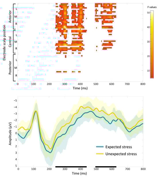 Effects of the stress expectancy on the single-trial event-related potentials (ERPs). (Top) Heat map indicating significant F values at p < 0.05 across electrodes and time points. The results were corrected with spatiotemporal clustering at an alpha level of 5%. (Bottom) Grand average ERP waveforms (20% trimmed mean of participant means) at a representative midline centro-frontal electrode, illustrating the increased negative-going activity for unexpected stress relative to the expected stress in target words. Shaded areas around each condition’s grand average ERP waveform represent the 95% Bayesian Highest Density Interval (HDI). Each bold line on the x-axis indicates the time window of a significant cluster.