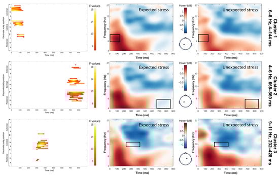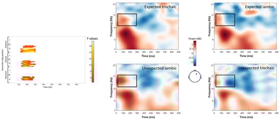 Effect of the stress expectancy on the single-trial time–frequency representations (TFRs). Each row represents a significant cluster identified by the ANOVA. Left: Heat map showing significant F values (p < 0.05) across the electrodes and time points (corrected with spatiotemporal clustering at an alpha level of 5%). Middle: Average TFRs for the target words with expected stress. Right: Average TFRs for the target words with unexpected stress. Black rectangles represent the time window and frequency band of the significant cluster.