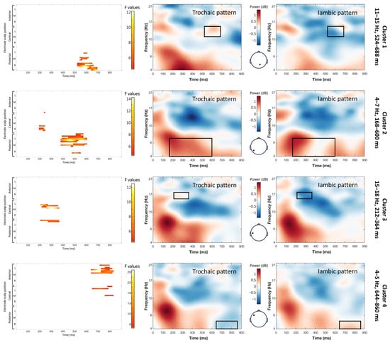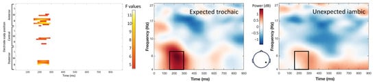 Effect of the stress pattern on the single-trial time–frequency representations (TFRs). Each row represents a significant cluster identified by the ANOVA. Left: Heat map showing the significant F values (p < 0.05) across the electrodes and time points (corrected with spatiotemporal clustering at an alpha level of 5%). Middle: Average TFRs for the target words with a trochaic pattern. Right: Average TFRs for the target words with an iambic pattern. Black rectangles represent the time window and frequency band of the significant cluster.