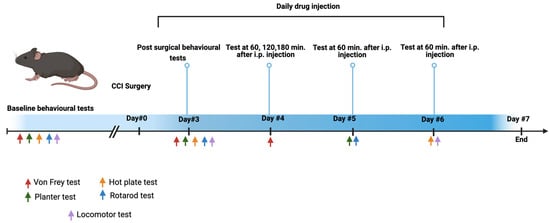 The flowchart of the study design. Baseline pain-related behaviors and motor co-ordination tests were performed on each study group. Neuropathic pain was induced using the chronic constriction of the sciatic nerve (CCI) technique. On day 3 post-surgery, pain-related behavior and motor co-ordination tests were conducted. On day 4 post-surgery, tactile allodynia was assessed using the von Frey test at 60, 120, and 180 min following the intraperitoneal (i.p.) administration of low and high doses of pregabalin, low and high doses of etanercept, a combination of low doses of pregabalin and etanercept, and saline (control). On day 5 post-surgery, the plantar thermal stimulation test and rotarod test were performed 60 min after drug and saline administration. On day 6 post-surgery, both the hot-plate test and locomotor test were conducted 60 min after drug and saline administration. Figure created in BioRender. Alothman, L. (2024) https://BioRender.com/n71a150 (accessed on 31 October 2024).
