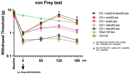 Behavioral assessments were performed on the ipsilateral hind paw of the animals both prior to and following CCI surgery, specifically on postoperative day 4, at different time points, 60, 120, and 180 min after drug administration. Mechanical allodynia was conducted following the procedure outlined by Chaplan et al. [] using von Frey filaments. The mice were housed in a Plexiglas chamber with a mesh metal floor and were given 1 h to acclimate before the start of testing. By using a modified up-down method, a set of von Frey filaments (Stoelting, Wood Dale, IL, USA) with stiffness levels increasing logarithmically from 3.84 to 5.88, expressing dsLog10 of [10£ force in (mg)], were applied to the paw. If the initially chosen filament did not elicit a withdrawal response, a thicker filament, indicating a stronger stimulus, was used. On the other hand, if a withdrawal response was observed, a weaker filament was introduced next. The force of the filament used first was 0.6 g. Each filament was applied perpendicularly to the paw with enough pressure to create a slight bend, maintaining contact for 2–3 s. The mechanical threshold was expressed as grams, indicating the force of the von Frey hair to which the animal reacted and showing the force of the von Frey hair that elicited a positive reaction from the animal (paw withdrawal, licking, or shaking) [,]. Each filament was applied to the paw five times, and the paw withdrawal threshold (PWT) was determined by the smaller of two consecutive filaments that elicited three or more withdrawal responses out of the five attempts [,,]. The experimenter who conducted the tests was blinded to the treatments.