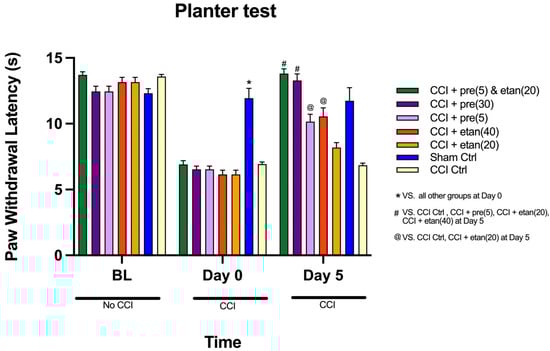The comparison of mean values of paw withdrawal latency (in seconds) at three time points (baseline, day 0, and day 5) among seven groups: sham control, CCI control, pregabalin at 5 mg/kg, pregabalin at 30 mg/kg, etanercept at 20 mg/kg, etanercept at 40 mg/kg, and combination treatment. All drug treatments were administered intraperitoneally (i.p.). The data are expressed as the mean ± SD of eight mice, and the two-way ANOVA measurement followed by Tukey’s post hoc test was used to determine statistical significance. * Statistically significant (p < 0.05) for the sham control group compared to all other groups at day 0. # Statistically significant (p < 0.05) for combination treatment and pregabalin at 30 mg/kg compared to CCI control, pregabalin at 5 mg/kg, etanercept at 20 mg/kg, and etanercept at 40 mg/kg at day 5. @ Statistically significant (p < 0.05) for pregabalin at 5 mg/kg and etanercept at 40 mg/kg compared to CCI control and etanercept at 20 mg/kg at day 5.