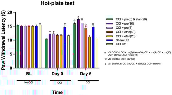 The comparison of mean paw withdrawal latency (in seconds) at three time points (baseline, day 0, and day 6) among seven groups: sham control, CCI control, pregabalin at 5 mg/kg, pregabalin at 30 mg/kg, etanercept at 20 mg/kg, etanercept at 40 mg/kg, and combination treatment of low doses of each drug. All drug treatments were administered intraperitoneally (i.p.). The data are expressed as the mean ± SD of eight mice, and the two-way ANOVA measurement followed by Tukey’s post hoc test was used to determine statistical significance. * Statistically significant (p < 0.05) for the sham control group compared to all other groups at day 0. @ Statistically significant (p < 0.05) for combination treatment, pregabalin at 5 mg/kg, etanercept at 40 mg/kg, and sham control compared to CCI control and etanercept at 20 mg/kg at day 6. # Statistically significant (p < 0.05) for pregabalin at 30 mg/kg compared to sham control, CCI control, etanercept at 20 mg/kg, and etanercept at 40 mg/kg at day 6.