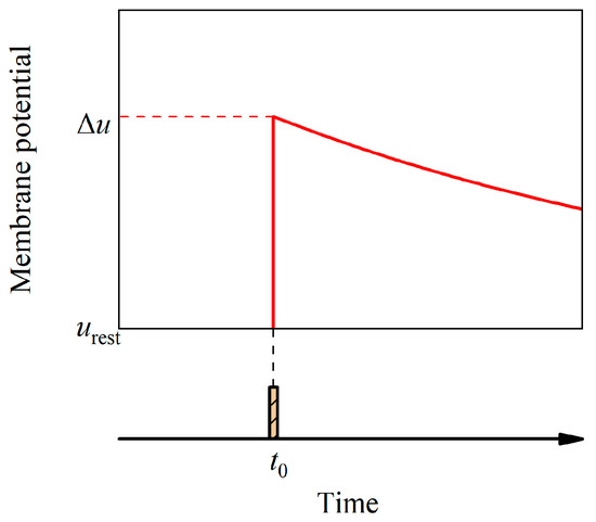 Membrane potential with a spike input. At time t0, the postsynaptic potential increases by Δu as a result of receiving a spike and then exponentially decays.