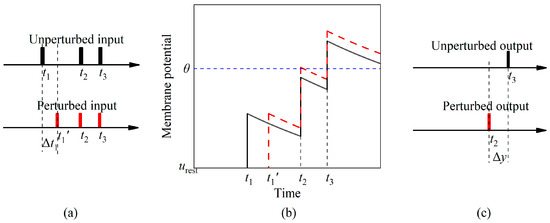 Biological research has demonstrated that the transmission of information between neurons in the brain occurs through a temporal spike signal [1,2]. SNNs are modeled after the behavior of biological neurons [3]. The dynamical model of SNNs states that neurons integrate membrane potential by receiving inputs and emit a spike once the membrane potential reaches the threshold. In comparison to traditional neural networks, SNNs can more accurately replicate the intrinsic activities of neurons, depict the complex dynamical mechanisms of biological neurons, and integrate the information in various dimensions such as time and frequency [4,5,6,7]. The spatio-temporal dynamical characteristics and event-driven advantages of SNNs make them a promising approach for simulating the functions of the human brain [8]. Although many studies have demonstrated the biologically plausibility and low energy consumption of SNNs [9,10], the complex input–output mapping of SNNs poses challenges in quantitatively analyzing their working mechanisms and behaviors, especially in terms of the output deviations caused by the noisy inputs.