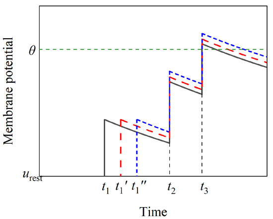 The formation process of output deviation is specifically demonstrated in this example. It includes the input spike train, the membrane potential, and the output time, as illustrated in Figure 2. The original input is . Under the influence of the input spikes, the membrane potential reaches the threshold at t3, resulting in an output time of y = t3. When a deviation occurs in the input, the perturbed input becomes , causing the membrane potential to increase, consequently advancing the firing time. As a result, the output time becomes y′ = t2. In this instance, Δy = y′ − y = t3 − t2 represents the output deviation for the given input and perturbation. Thus, it can be inferred that the perturbation directly affects the membrane potential, which consequently leads to possible changes in the output deviation.