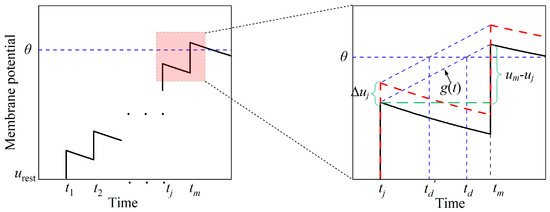 where tm represents the actual firing time without perturbation, tj is the moment with the highest potential prior to the actual firing time, um and uj are the membrane potentials corresponding to tm and tj, respectively, and Δuj represents the difference between the perturbed potential and the unperturbed potential at tj. In accordance with Definition 1, the sensitivity of a neuron can be computed as