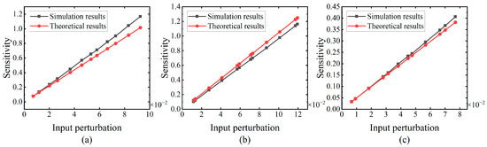 Trend of the sensitivity variation in response to the input perturbations under the three distinct weights. The number of the input synapses is 20, the number of time steps are 64, and the time constant is 50 ms. The simulation results are depicted by the black line, while the theoretical results are represented by the red line. The weights in the figure are (a) W1, (b) W2, and (c) W3.
