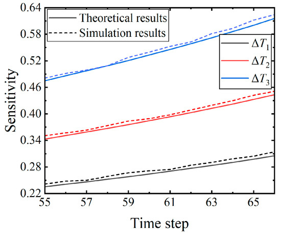 The third experiment aims to investigate the impact of the number of time steps on the sensitivity. In this experiment, all parameters other than the number of time steps are kept fixed. Except for the parameters in Table 3, all others are identical to those used in the second experiment. The experiment was conducted with 12 different numbers of time steps ranging from 55 to 66 under the three input perturbations, and the corresponding theoretical sensitivities were obtained. The simulation results were obtained using identical parameters. The average computation time for the simulation results is about 36 min.