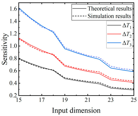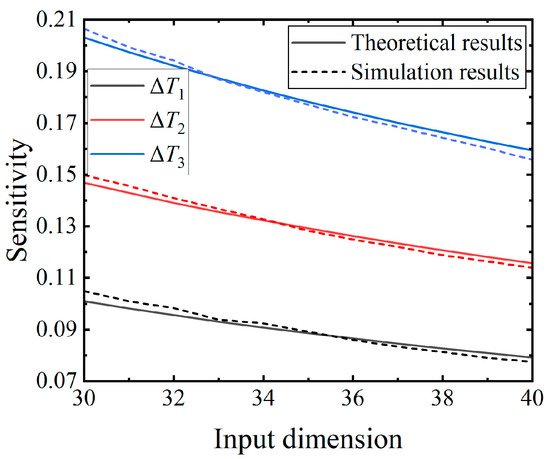 The objective of the fourth experiment is to examine the impact of the input dimension on the sensitivity. All parameters, except the input dimension, are held constant. Except for the parameters in Table 4, all others are identical to those used in the second experiment. To prevent errors resulting from insufficient firing due to a low number of inputs, the input dimension is set to a total of 11 integers ranging from 30 to 40. All parameters used in the calculation of both the theoretical and simulation results share identical values. The average computation time for the simulation results is about 112 min.