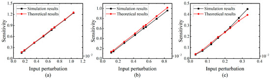 The sensitivities obtained are illustrated in Figure 5, with the magnitude of the input perturbations being represented by the expectation of the potential difference. Figure 5 shows that, under the three different weights, both the theoretical and simulation results exhibit an upward trend in response to the increasing input perturbation. This implies that greater input perturbation results in higher sensitivity for an SN with fixed parameters. Furthermore, the theoretical results are in reasonable agreement with the simulation results, showing consistent trends. In conclusion, the effectiveness of the theoretical sensitivity calculation with varying weights is demonstrated.
