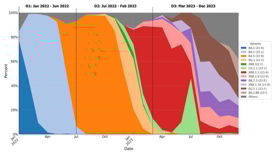 The division was due to the dominance of Omicron subvariants in Poland, according to the Global Initiative on Sharing All Influenza Data (GISAID). The first period was dominated by BA.1 (21 K) and BA.2 (21 L), the second by BA.5 (22 B), BQ.1 (22 E), and XBB (22 F), and the third by XBB.1.5 (23 A), CH.1.1 (23 C), XBB.1.9 (23 D), XBB.1.16 (23 B), EG.5.1 (23 F), BB.2.3 (23 E), and BA.2.86 (23 I) (Figure 1) [39]. There were no rehospitalizations due to COVID-19 during the analyzed periods.