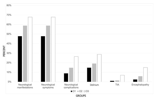 Over time, a higher incidence of neurological manifestations between subsequent periods was observed (O1 vs. O3 p = 0.005) in general, as well as in the occurrence of any kind of neurological symptoms (O1 vs. O3 p = 0.017) and complications (O1 vs. O3 p < 0.001). Furthermore, over time a higher incidence of delirium (O1 vs. O3 p = 0.016), TIA (O1 vs. O3 p = 0.015), and encephalopathy (O1 vs. O3 p < 0.001) were observed (Figure 4).