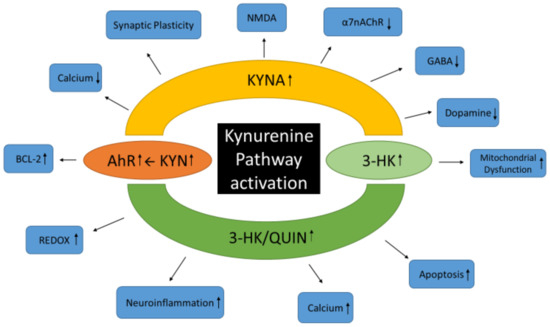 Kynurenine pathway-centric pathophysiology model. Depiction of some of the receptors, pathways, and processes affected by increased levels of major kynurenine pathway metabolites KYN, KYNA, 3-HK, and QUIN after pathway activation. AhR = aryl hydrocarbon receptor; α7nAChR = Alpha7 nicotinic receptor; BCL-2 = B-cell Lymphoma 2; GABA = γ-aminobutyric acid; KYN = Kynurenine; KYNA = Kynurenic Acid; NMDA = N-methyl-D-aspartate; QUIN = Quinolinic Acid; 3-HK = 3-hydroxykynurenine. ↑, increased process; ↓, decreased process.