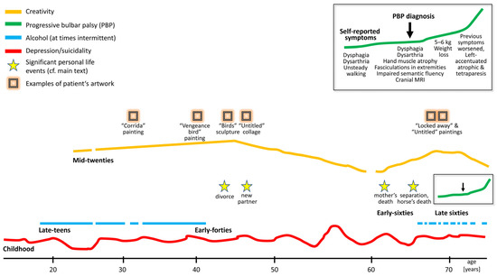 Timeline of creativity and major life events in relation to mood changes, alcohol use, and progressive bulbar palsy (PBP) during our patient’s lifetime. This scheme, which was developed based on the patient’s history, gives a qualitative rather than a quantitative overview of events. A simplified version of this scheme was used as a working model in the psychotherapeutic process.