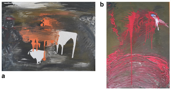 Examples of our patient’s earlier paintings. Titles and years of the artist’s age at production are provided. “Corrida” (31) (a); “Vengeance Bird” (40) (b).
