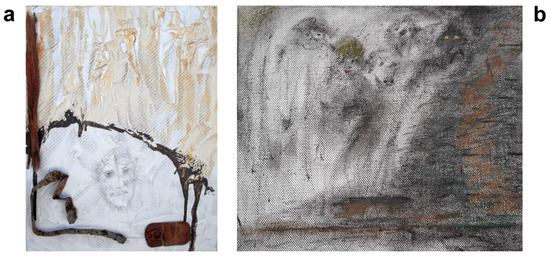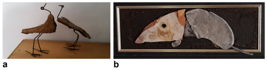 Although his art mostly comprises collages, preferably made from materials that nature has “reclaimed” and transformed, he has also created some paintings (Figure 3, Figure 4, Figure 5 and Figure 6). Notable examples from the peak of his creativity in his forties include his painting “Vengeance Bird”, produced at age 40; his sculpture called “Birds”, completed at 45; and an untitled collage finished at age 47; see Figure 3b and Figure 4a,b, respectively.