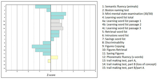 Neuropsychological testing (according to University of Basel, Memory Clinic, Consortium to Establish a Registry for Alzheimer’s Disease (CERAD)–Plus, 1987, revised edition, January 2005, https://www.memoryclinic.ch/de (accessed on 13 April 2024)). Green horizontal columns indicate test results that are part of the basic CERAD test battery, with the gray columns braking down subsections of test 4 (learning word list). The yellow horizontal columns indicate the outcome of additional tests that are part of the CERAD-Plus test battery.
