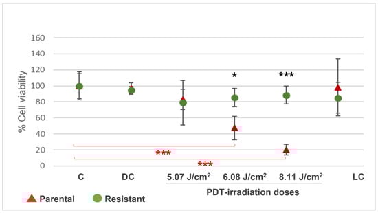 Percentages of cell viability by MTT after PDT in T98G parental and PDT-resistant populations. Parental and resistant T98G cells were incubated with Me-ALA for 4 h and irradiated at 5.07, 6.08, and 8.11 J/cm2. Resistant populations had high viability at irradiation doses lethal to the parental populations. C = control (without Me-ALA, without light); DC = drug control (with Me-ALA, without light); LC = 8.11 J/cm2 light control (without Me-ALA, with light, 8.11 J/cm2); photodynamic therapy (PDT)-treated (Me-ALA + 5.07 J/cm2; Me-ALA + 6.08 J/cm2; Me-ALA + 8.11 J/cm2). * p < 0.05; *** p = 0.001 (resistant respect to parental cells, black asterisks), *** p ≤ 0.001 (resistant with PDT respect to resistant C, red asterisks). Results are reported as the mean ± standard error of mean (SEM). The experiment was performed 3 times. Results of a representative experiment are shown.