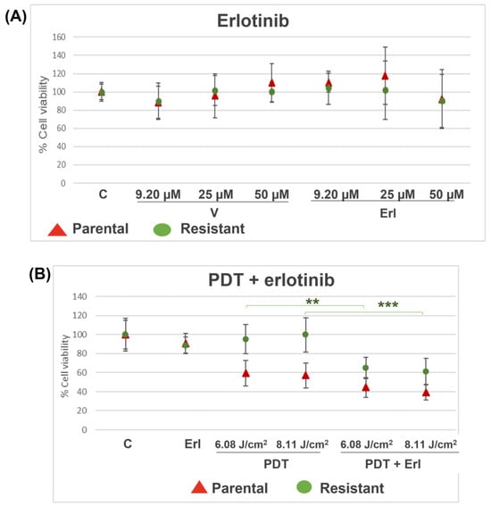 (A) Percentages of cell viability by MTT in parental and resistant T98G cells incubated with erlotinib. Parental and resistant T98G cells were incubated with erlotinib (Erl) for 24 h at doses of 9.2, 25, and 50 µM. Erlotinib and its vehicle DMSO (V) did not affect the cell viability (at 24 h) of parental and resistant T98G populations. (B) Cell viability by MTT after PDT and erlotinib combination in parental and resistant T98G cells. Cells were incubated with Me-ALA (1 mM) and erlotinib (50 uM) for 4 h and then irradiated at 6.08 and 8.11 J/cm2. After 24 h, cell viability was measured by MTT. PDT in combination with erlotinib reduced viability in resistant populations compared to PDT alone. Photodynamic therapy (PDT)-treated (Me-ALA + 6.08 J/cm2; Me-ALA + 8.11 J/cm2). ** p < 0.01; *** p = 0.001 (resistant populations, green asterisks). Results are reported as the mean ± standard error of mean (SEM). The experiment was performed 3 times. Results of a representative experiment are shown.