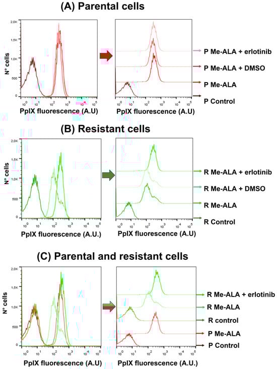 In order to know if erlotinib has an effect on the PpIX content in parental and resistant cells when incubated with Me-ALA, the cells were seeded in 35 mm dishes. The next day they were incubated with erlotinib and Me-ALA for 4 h. The content of the photosensitizer PpIX was determined by flow cytometry. In the groups with Me-ALA and without erlotinib, the amount of photosensitizer was lower in the resistant populations compared to the parental cells, as it was previously determined in our publication [10]. Erlotinib increased the content of PpIX from Me-ALA in the resistant population, but not in the parental cells (Figure 3A,B). With the incubation of the EGFR inhibitor drug, the content of the photosensitizer PpIX in resistant populations was equal to the PpIX content found in parental cells (Figure 3C–E).
