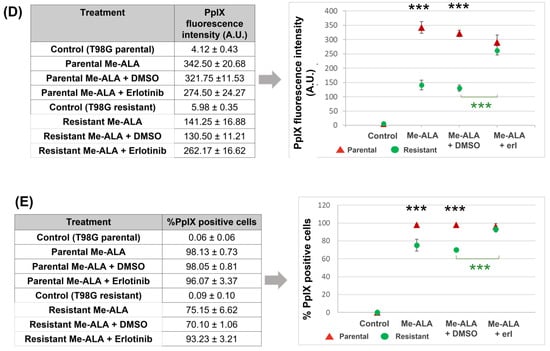 Flow cytometry of PpIX content after Me-ALA and erlotinib incubation. Parental (A) and resistant cells (B) were incubated with Me-ALA (1 mM) and erlotinib (50 µM) for 4 h. PpIX fluorescence was measured by flow cytometry. Erlotinib increased the content of PpIX in the resistant population (B–E). C = control (without Me-ALA, without erlotinib); Erl = erlotinib; A.U. = arbitrary units. *** p < 0.001 (resistant respect to parental cells, black asterisks), *** p < 0.001 (resistant cells, green asterisks). Results are reported as the mean ± SEM. The experiment was performed 3 times. Results of a representative experiment are shown.