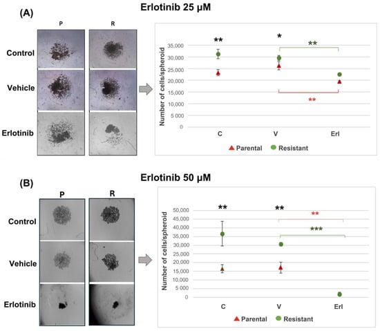 Parental and resistant T98G spheroids incubated with erlotinib. Photographs and cell number count per spheroid 3 days after seeding 2000 cells per well in U-bottom plates with agarose. Cells were seeded and incubated with erlotinib (Erl) at the dose of 25 µM (A) and 50 µM (B) for 3 days. Erlotinib inhibited the proliferation of parental and resistant T98G 3D cultures. C = control, V = vehicle, Erl = erlotinib. * p < 0.01; ** p < 0.01 (resistant respect to parental cells, black asterisks); ** p < 0.01 (parental cells, green asterisks; resistant cells, red asterisks) and *** p = 0.001 (parental cells, green asterisks). Results are reported as the mean ± SEM. The experiment was performed 3 times. Results of a representative experiment are shown.
