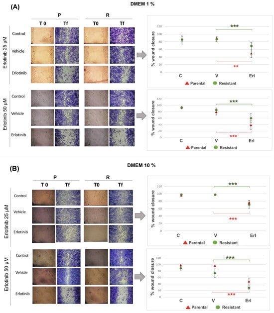 Using 1% DMEM, when the wound closure percentage reached 90% in the control group (at 4 days), the parental populations treated with 25 µM erlotinib had 70% wound closure and the resistant cells had 50% (without statistically significant differences between parental and resistant cells). Parental populations treated with 50 µM erlotinib had 60% wound closure and resistant cells 40% (no statistically significant differences) (Figure 5A). Using 10% DMEM, when the wound closure percentage reached 90–100% in the control group (at 2 days), the parental and resistant populations treated with 25 µM erlotinib had around 70%. Parental populations treated with 50 µM erlotinib had 30% wound closure and resistant cells 50% (Figure 5B).