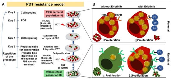 Protocol for obtaining PDT-resistant T98G cells and the effect of erlotinib. (A) Timeline: initial population of T98G cells (parental) is treated with PDT (Me-ALA); the surviving cells are amplified forming a population of resistant cells to one cycle of PDT. The process is repeated for 8 cycles (a selected population resistant to PDT is formed). (B) PDT-resistant T98G cells overexpress EGFR mRNA, accumulate less PpIX and have increased 3D proliferation with respect to parental cells [14]. Treatment with the EGFR inhibitor erlotinib (erl) causes a decrease in 3D cell proliferation (parental and resistant populations). Additionally, when treated with erlotinib, resistant cells regain the ability to accumulate PpIX becoming sensitive to PDT.