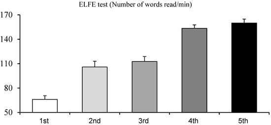 The ANOVAs reported a significant class effect for the score of the ELFE test (F(4,129) = 53.15, p < 0.001, η2 = 0.62). The Bonferroni post hoc test reported a significant difference between the different classes (all p < 0.001) except for two comparisons (the second grade vs. the third grade, and the fourth grade vs. the fifth grade), see Figure 1.