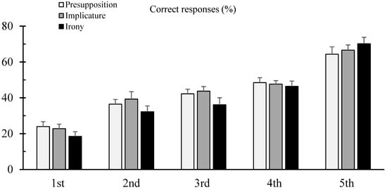 Figure 2 shows the percentage of correct responses to the three different types of implicitness (presupposition, implicature, and irony) in the different classes. The ANOVA showed a significant class effect only (F(4,128) = 52.45 p < 0.001, η2 = 0.48). The Bonferroni results reported significant differences between the classes (all p < 0.001) except for two comparisons (the second grade vs. the third grade and the third grade vs. the fourth grade).