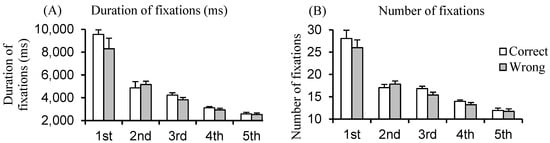 Figure 3A,B show the duration and the number of fixations during reading sentences. The ANOVA reported a significant class effect (F(4,124) = 12.59, p < 0.001, η2 = 0.29 and F(4,124) = 13.93, p < 0.001, η2 = 0.26, respectively, for the duration and the number of fixations). The post hoc test showed that children in the first class had longer and more frequent fixations than children in the other classes (all p < 0.001); the post hoc test also reported that the duration and the number of fixations were significantly longer and more frequent in the second class with respect to the fourth and fifth classes (all p < 0.01). The ANOVA also showed a significant effect of the understanding of the implicitness (correct versus wrong) (F(1,124) = 6.52, p < 0.01, η2 = 0.01 and F(1,124) = 6.98, p < 0.01, η2 = 0.01, respectively, for the duration and the number of fixations). The duration and number of fixations were significantly longer and more frequent for correct understanding than for incorrect understanding of implicitness. Finally, the ANOVA reported an interaction between the class and understanding (F(4,124) = 4.20, p < 0.004, η2 = 0.02 and F(4,124) = 3.59, p < 0.009, η2 = 0.02, respectively, for the duration and number of fixations). Only in children of the first class were the duration and frequency of fixations significantly more important for the sentences correctly understood (p < 0.001).