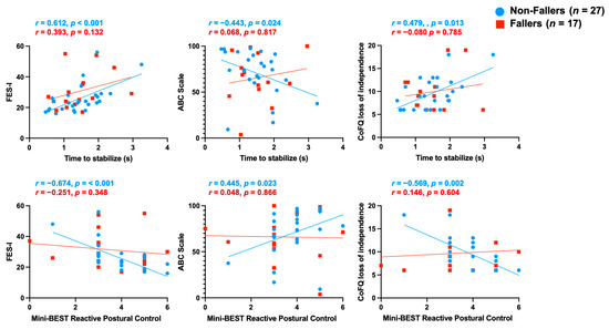 Scatterplots depicting bivariate relations between fall-related psychological parameters and reactive stepping outcome measures. Note: Spearman rho (r) correlation and corresponding p values for FES-I, balance confidence, and feared consequences of falling with time to stabilize and mini-BEST reactive postural control. Blue circles indicate non-fallers, and red squares indicate fallers.