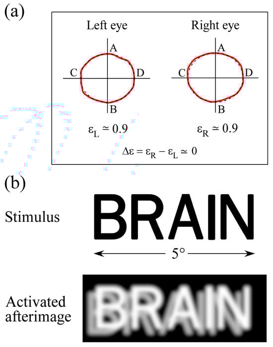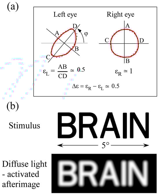 (a) Maxwell centroid outlines for a typical reader. The diameters of the real centroids on the fovea are about 100 to 150 μm, but here on the screen of the foveascope, the enlarged outlines are about 3 cm. The circular outline observed for the right eye determines the ocular dominance. The typical asymmetry Δε reaches + 0.5 for the right-eye-dominant observer. (b) After fixation on the stimulus—i.e., the word BRAIN—the diffuse light-activated afterimage is observed through closed eyelids. The reconstructed afterimage is perceived by the observer.