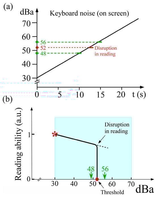 (a) Observation of the disruption in reading by the observer with DCD and dyslexia when the acoustic noise was linearly increased versus time. The background level of the noise in the room was 28 dBa. The precision of the noise levels in our experiments is estimated to ±2 dBa. (b) Qualitative reading ability of the student when the acoustic noise was varied in the 30–70 dBa range. In this experiment, the student with DCD and dyslexia verbally pointed out when his understanding and comprehension were completely disrupted. The specific instructions were simple: a vocal signal was given to start the silent reading, and the student gave a vocal signal (“stop”) when he reached the disruption threshold.