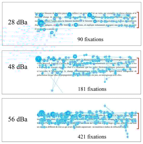 In order to characterize this disruption, we have recorded the number of fixations below and above this threshold at 48 dBa and 56 dBa of acoustic noise intensities, respectively. The corresponding results are shown in Figure 4 when the student with DCD and dyslexia read a five-line text. Below the threshold, the number of fixations is 181, while above the threshold, the number of fixations reaches 421, indicating chaotic disorder. The eyes become unable to follow the lines of the text. In contrast, for the typical reader, varying the acoustic noise level from 30 to 70 dBa did not show any disruption (Figure 5). The acoustic noise only slightly increased the number of fixations. The comparison of the evolutions of the number of fixations is shown in Figure 6 for the two students. While the number of fixations is even larger in absence of the added external acoustic noise, the sharp increase around 50 dBa is clear for the student with DCD and dyslexia.
