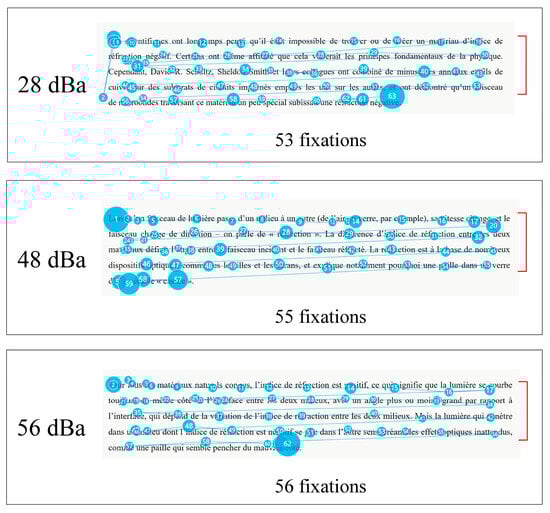 Eye tracking measurements for the typical reader. Without added acoustic noise, 53 fixations are necessary to read the first four lines. At 48 and 56 dBa, only a slight increase in the number of fixations is observed.