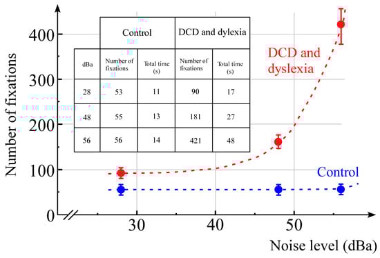 The aim of this study is to investigate and understand the role of an increased acoustic noise in the behavior of a reader with DCD and dyslexia. In particular, it is shown that a disruptive effect occurs in the 50 to 60 dBa range of acoustic noise when a cross-modal interaction between the auditory and the visual noises is involved, leading to disruption in reading. This results in a chaotic increase in the number of eye fixations that is experimentally detected by an eye tracker. In contrast, no disruption is observed in a typical reader at the same levels of acoustic noise. Cross-modal interactions are known to be ubiquitous in animal and human development and behavior and take place in the multimodal areas in the brain [18,33,34,35]. It generally involves the synergetic integration of two sensory systems. Recently, in mice, olfactory stimuli has been shown to induce excitation in the somatosensory cortex in the early postnatal period [36]. It has also been shown that different modalities of sensation are integrated even in invertebrates. The interaction between olfactory and visual learning has been isolated in Drosophila [37]. Even bumblebees perform cross-modal recognition [38]. The monomodal nuclei corresponding to vision and touch, respectively, are compared in multimodal higher centers in the brain to identify the same object in each sensory modality, as in humans, who integrate visual and haptic information quite easily [39].