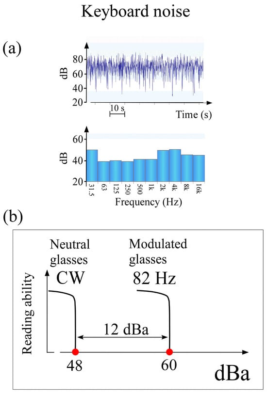 (a) Keyboard noise characteristics showing the fluctuations versus time and the corresponding spectrum in the acoustic range. (b) Observation of the disruption thresholds when using the neutral glasses and the modulated glasses for the DCD-and-dyslexia student. A 12 dBa improvement is observed.