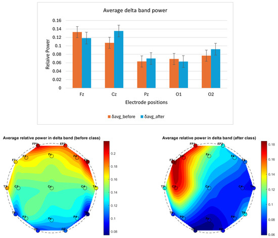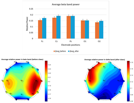 As a continuation of the inter-relational analysis, an examination of beta power will also be carried out. At occipital positions, beta activity signifies active visual engagement, and at parietal positions, it signifies active processing of sensory information. However, if the brain loses the capacity to perform and slows down, in an attempt to maintain alertness levels, an increase in the beta activity is the brain’s way of compromising without affecting the performance, which is especially relevant to the frontal sites. The delta waves have traditionally been associated with the non-rapid eye movement (nREM) sleep stage that propagates across the cortex. However, there are also data that support an increase in delta power in states relevant to motivation [63], and arithmetic tasks [64]. Another study [65] by Harmony et al. monitored EEG activity during a mathematical task and observed an increase in delta power in the pre-frontal cortex and an increase in both delta and beta powers in the left-parietal cortex.