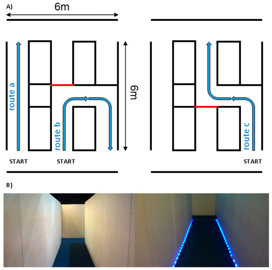 (A) Diagram depicting straight route, U-shaped route, and S-shaped route and (B) straight route without (left) and with LED cue (right).